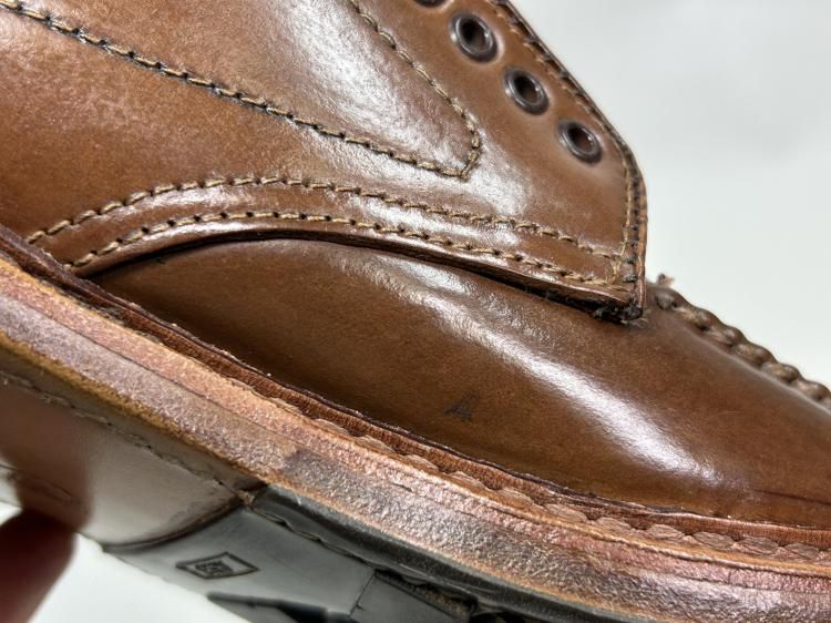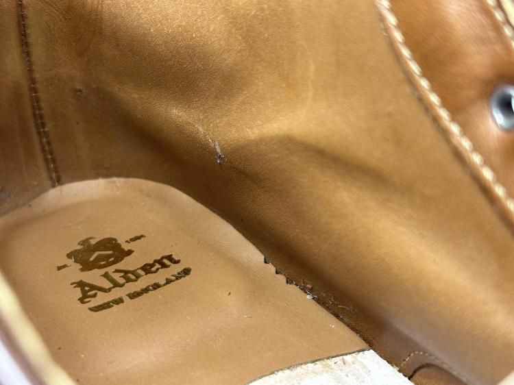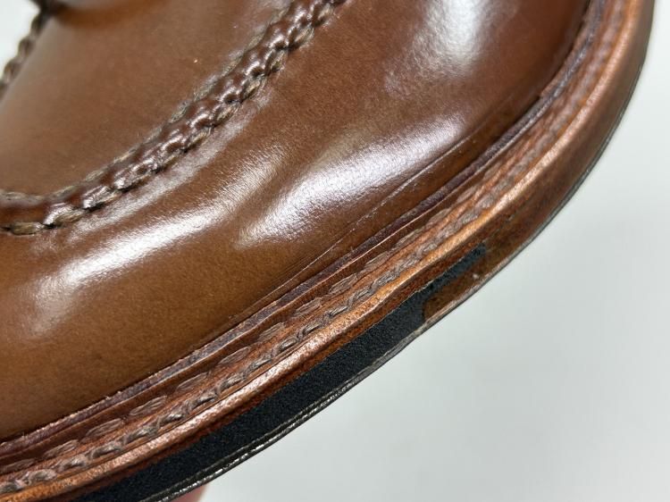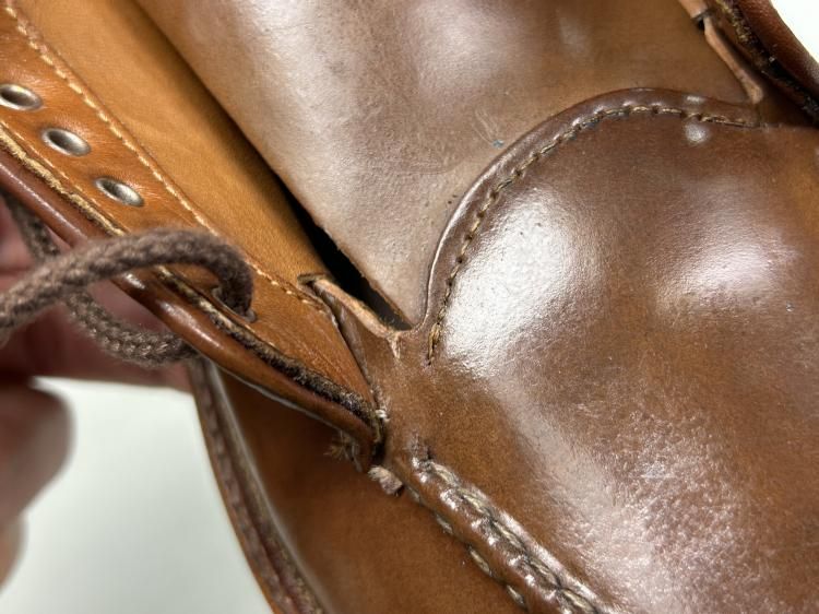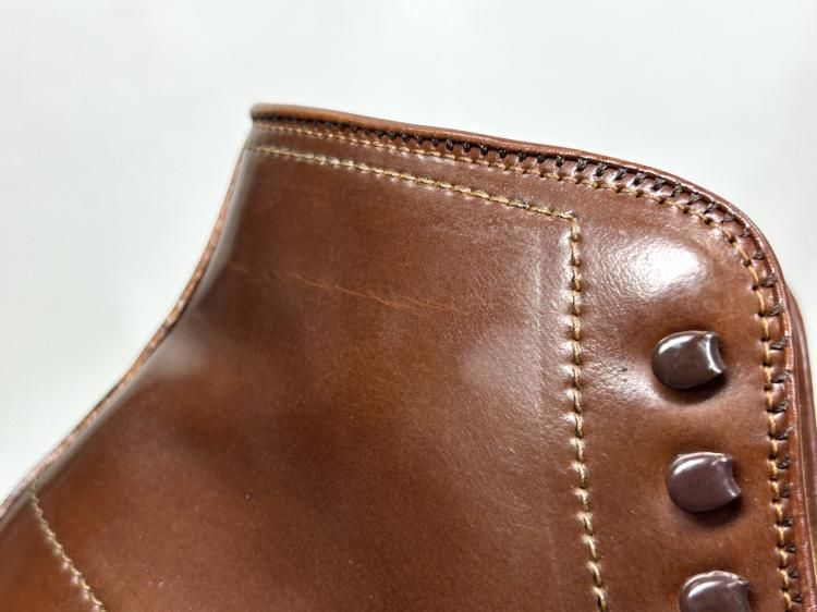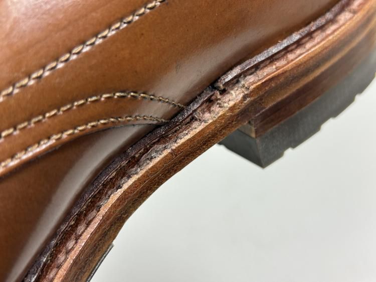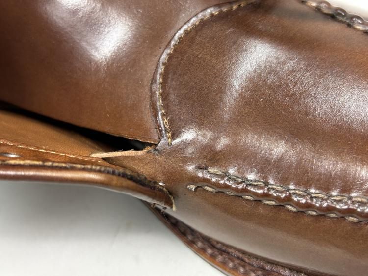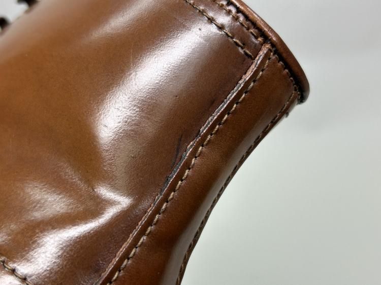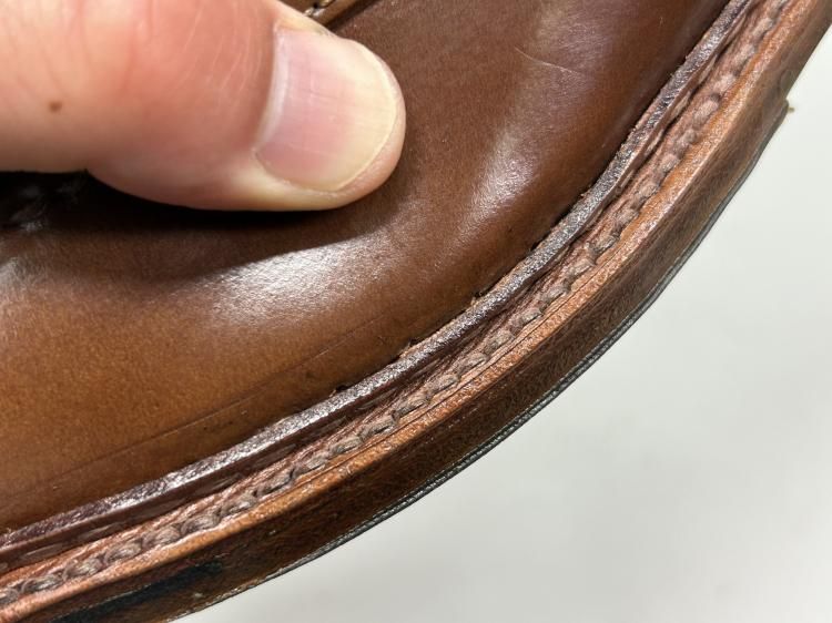 リジェクト品:おそらく原因はコバ上の製造時のキズ、吊り込み時の穴が少し見えている点、中底の芯?が見えている点かと思います。