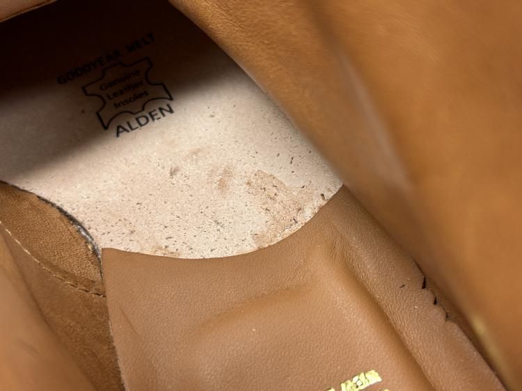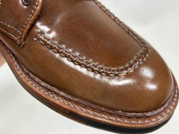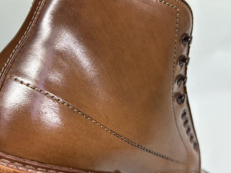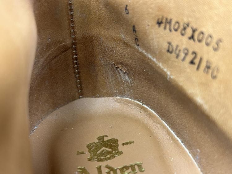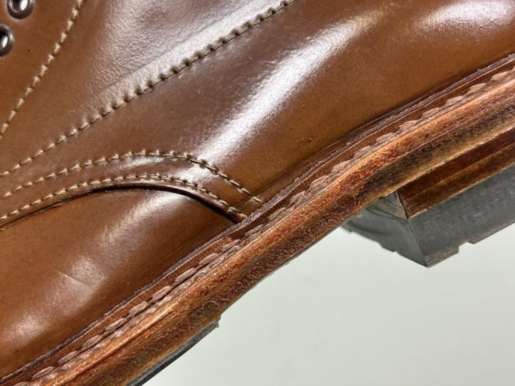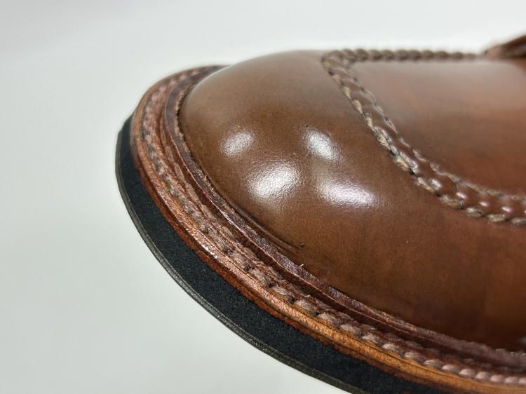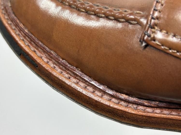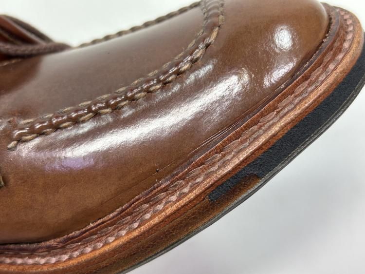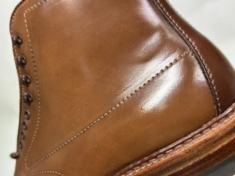 リジェクト品:おそらく原因はコバ上の製造時のキズ、吊り込み時の穴が少し見えている点、中底の芯?が見えている点かと思います。